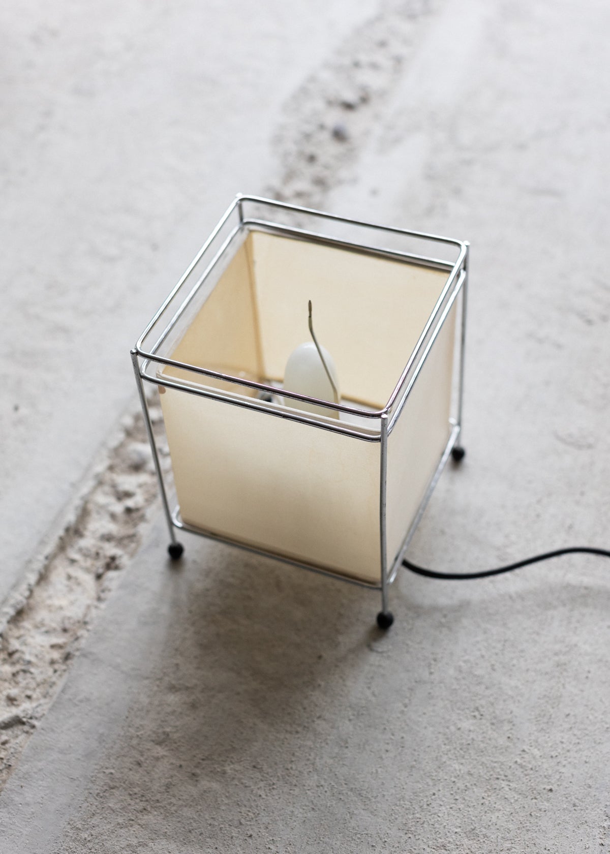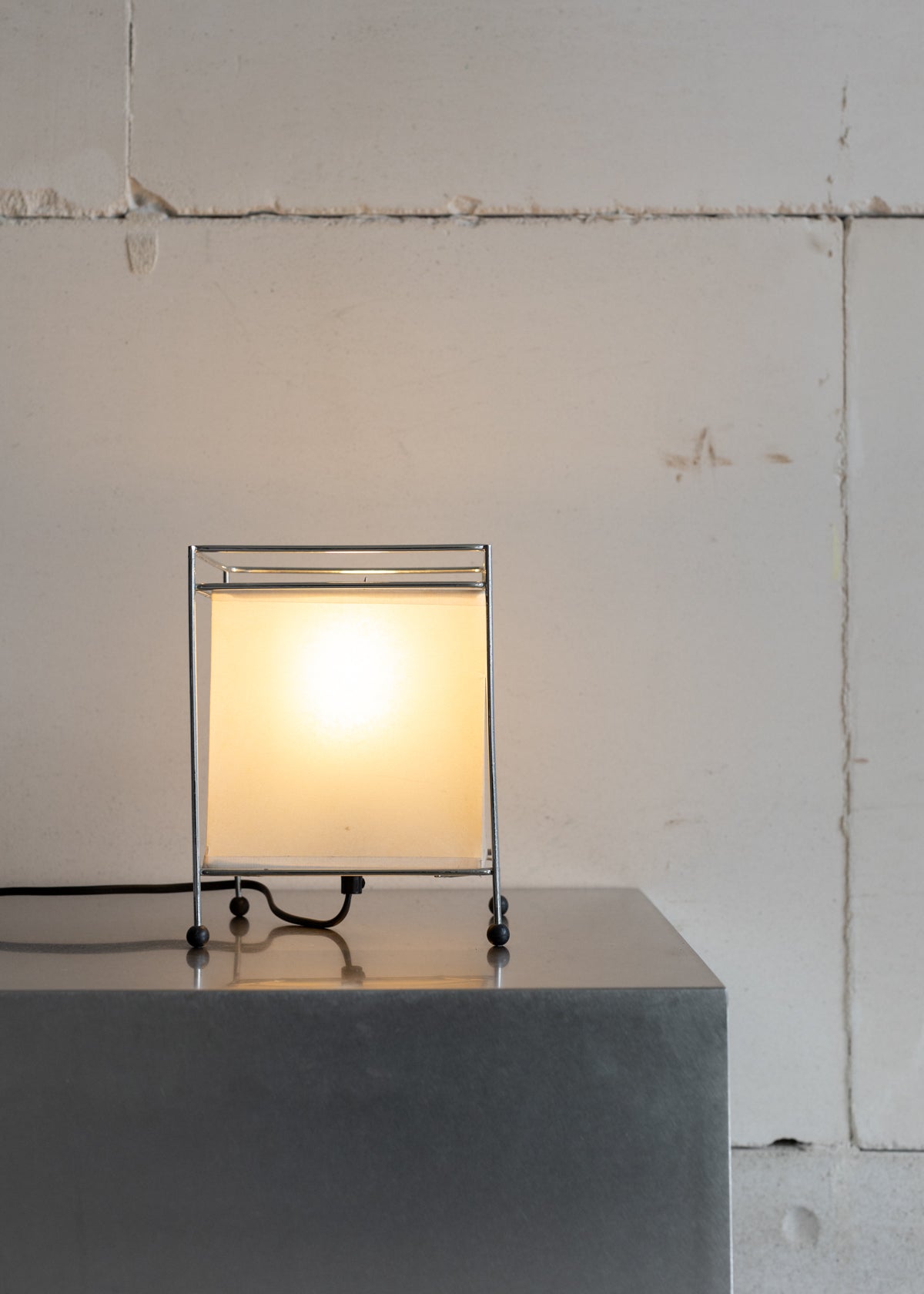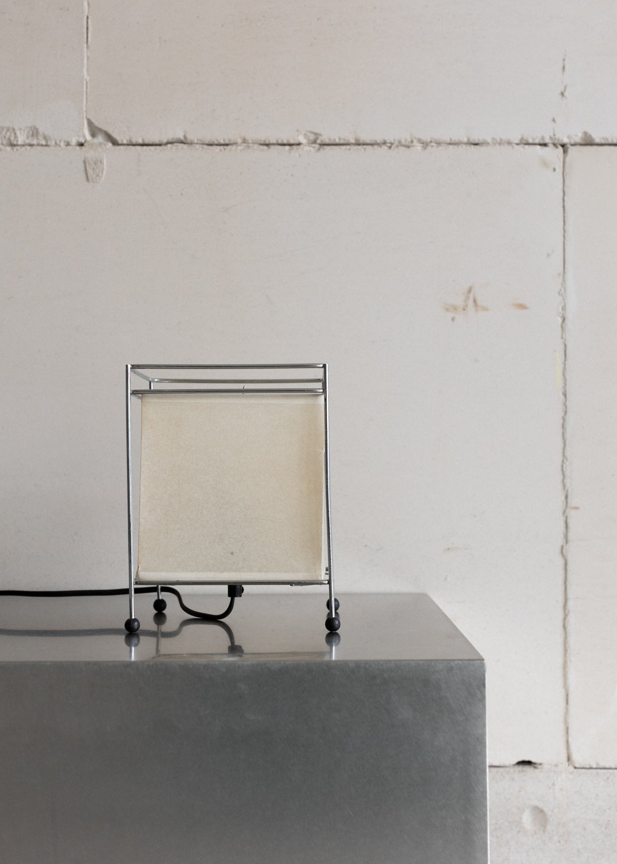 With a similar appearance to the Lotek lamp we offer this small elegant table lamp by Tarogo. Chrome base and rice paper shade. The shade is reinforced with transparant plastic on the inside.