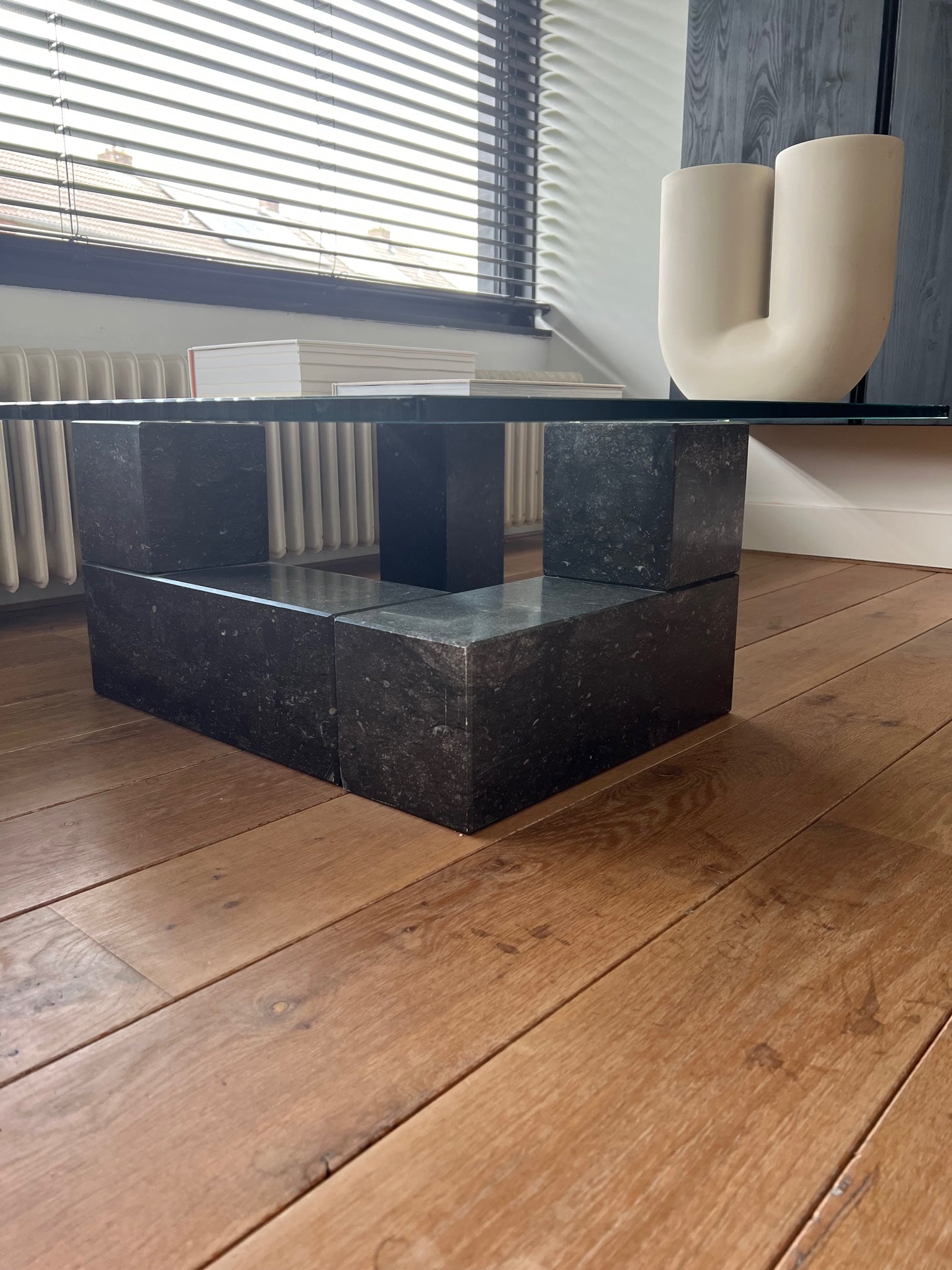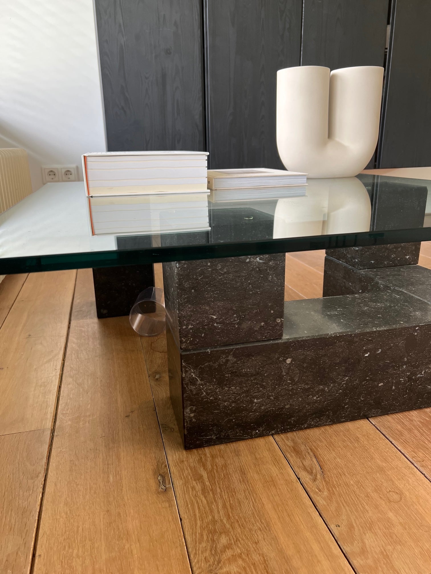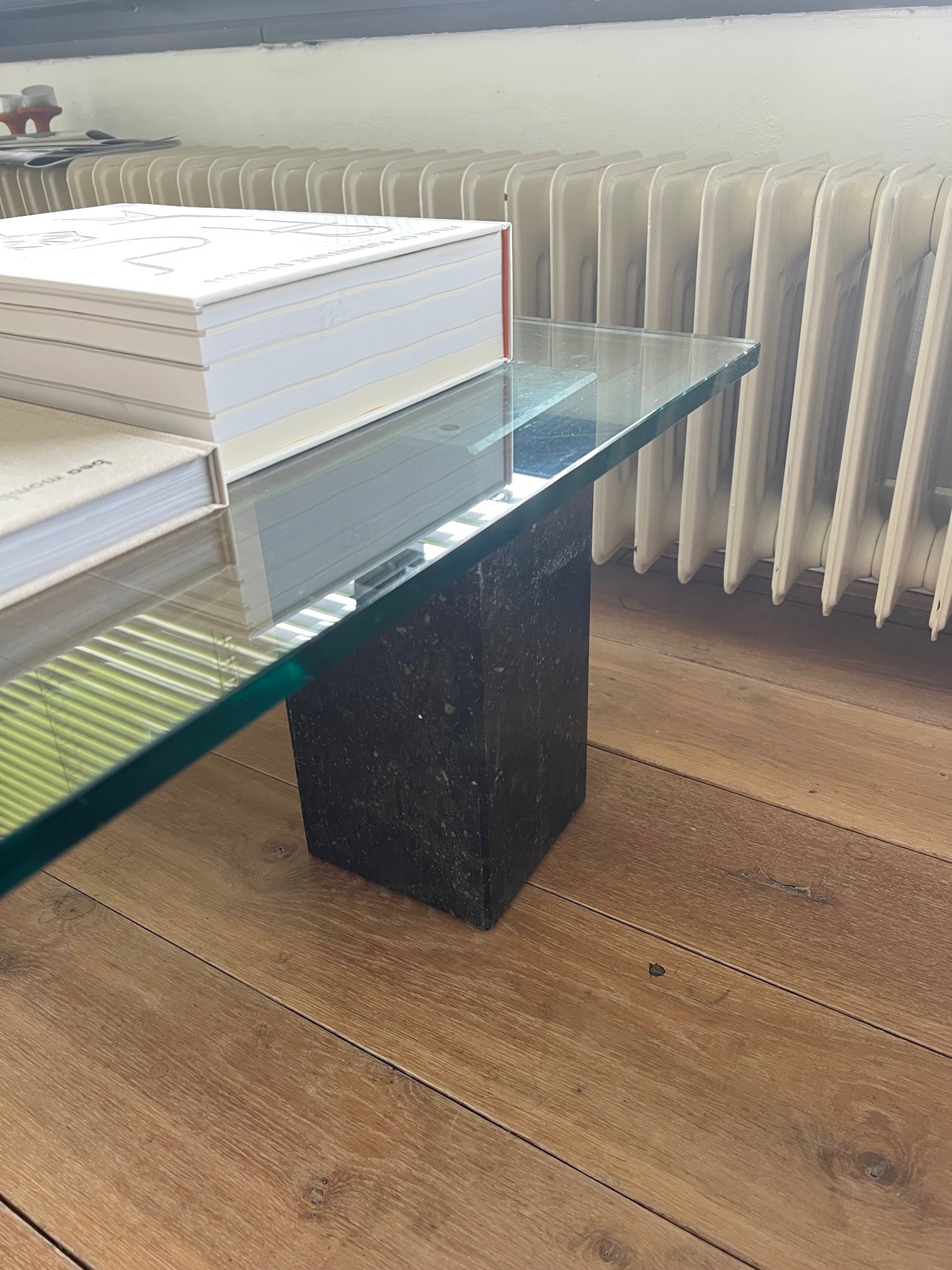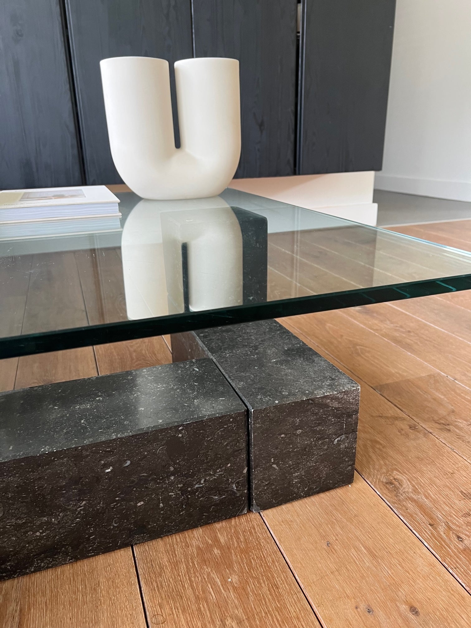 The table consists out of 3 very heavy stone elements with a very nice dark colour. They can be placed beneath the glass as you like.