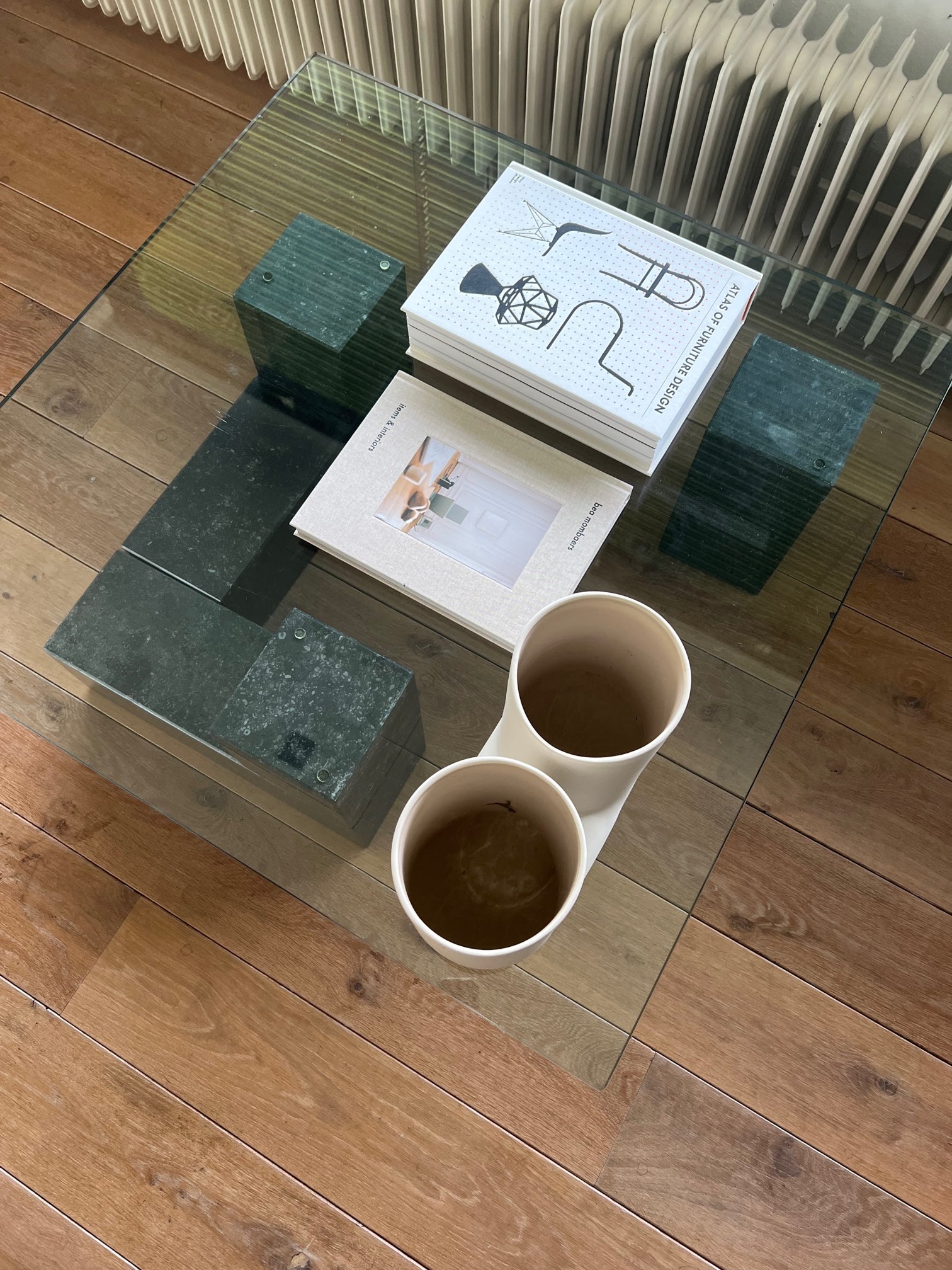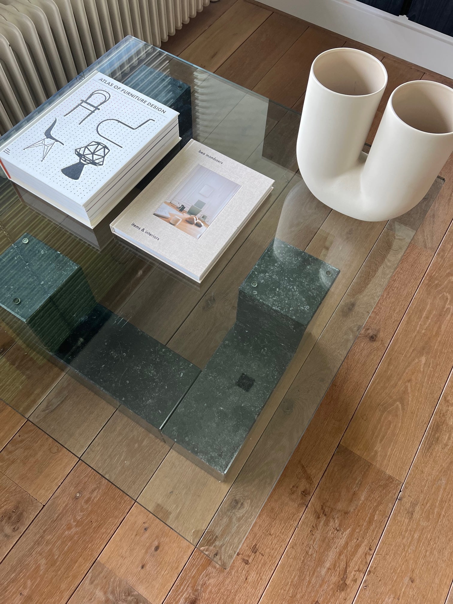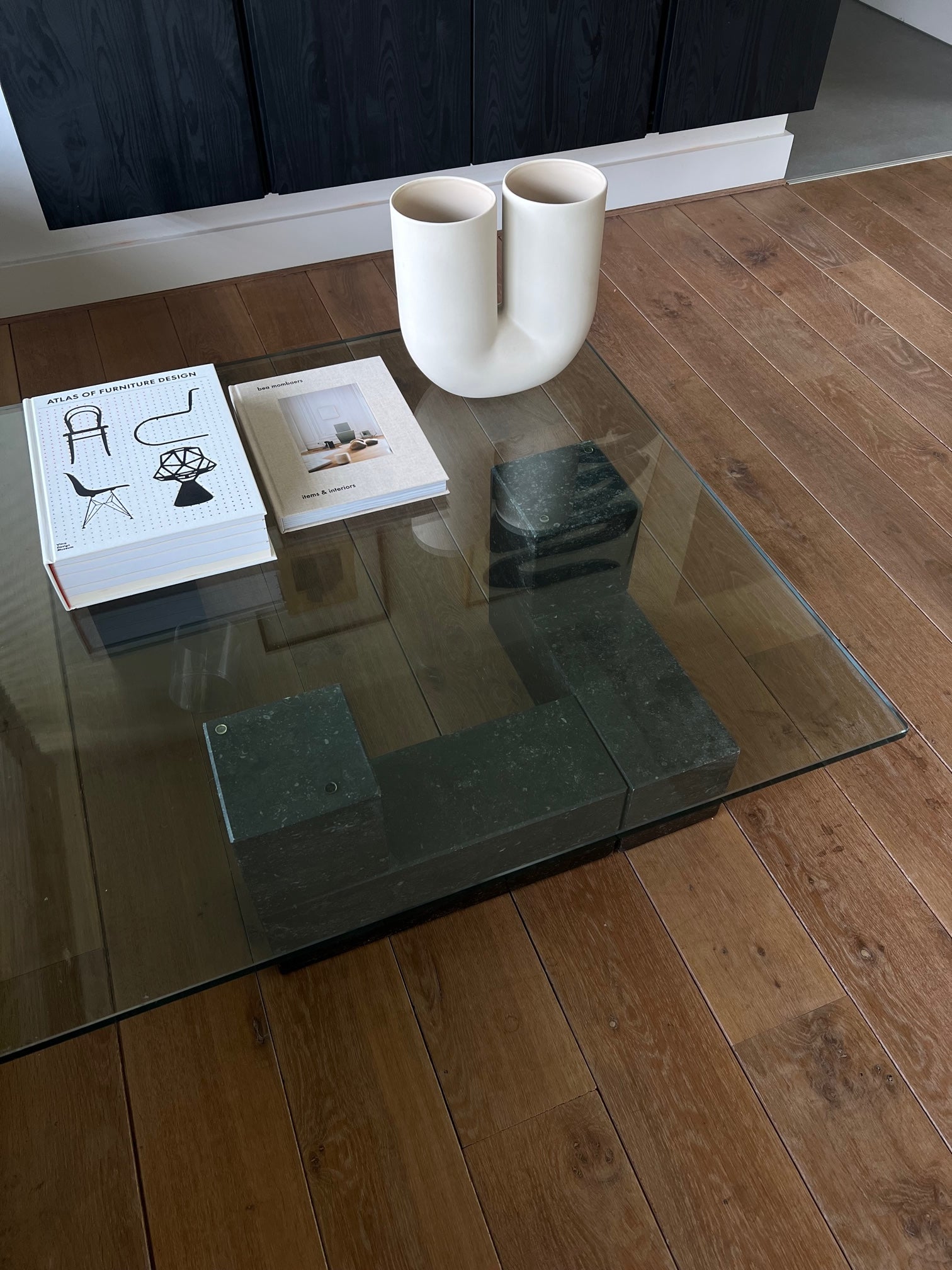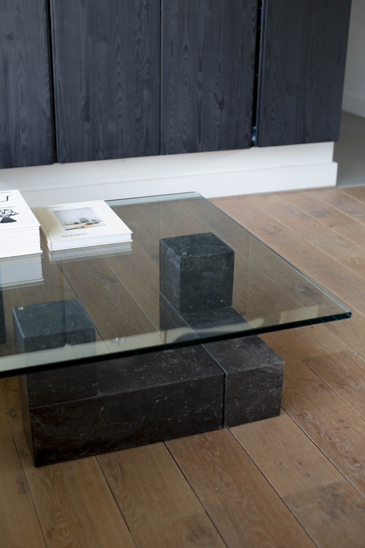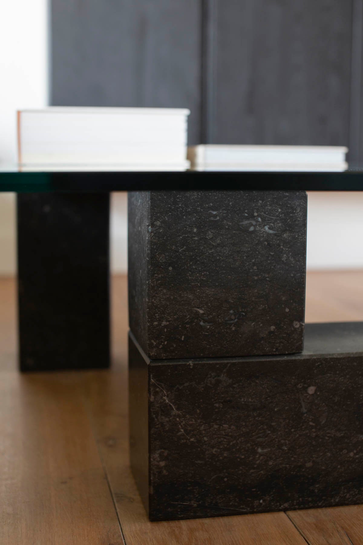 The table consists out of 3 very heavy stone elements with a very nice dark colour. They can be placed beneath the glass as you like.