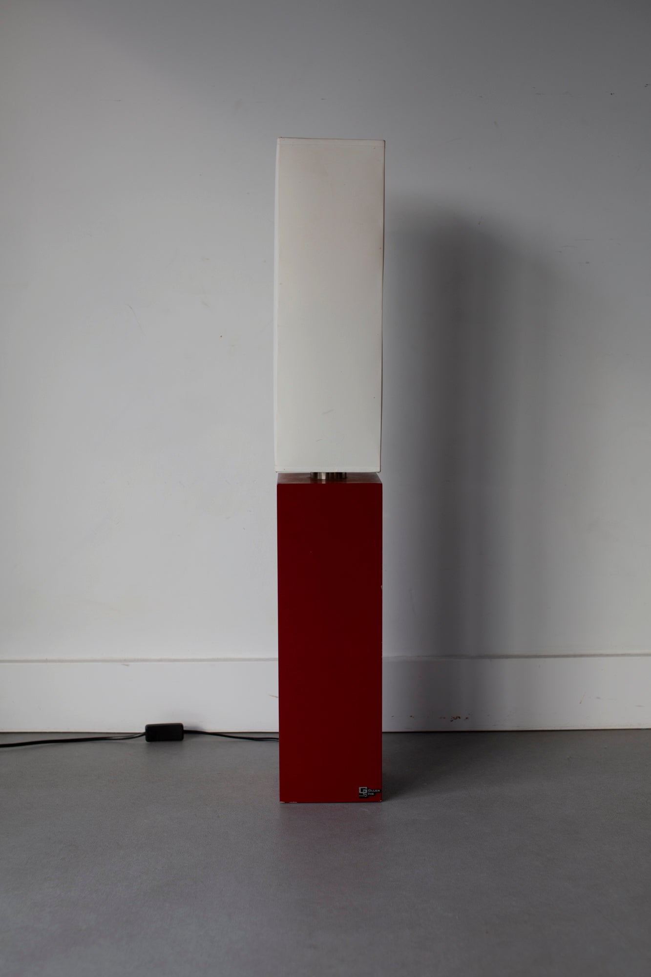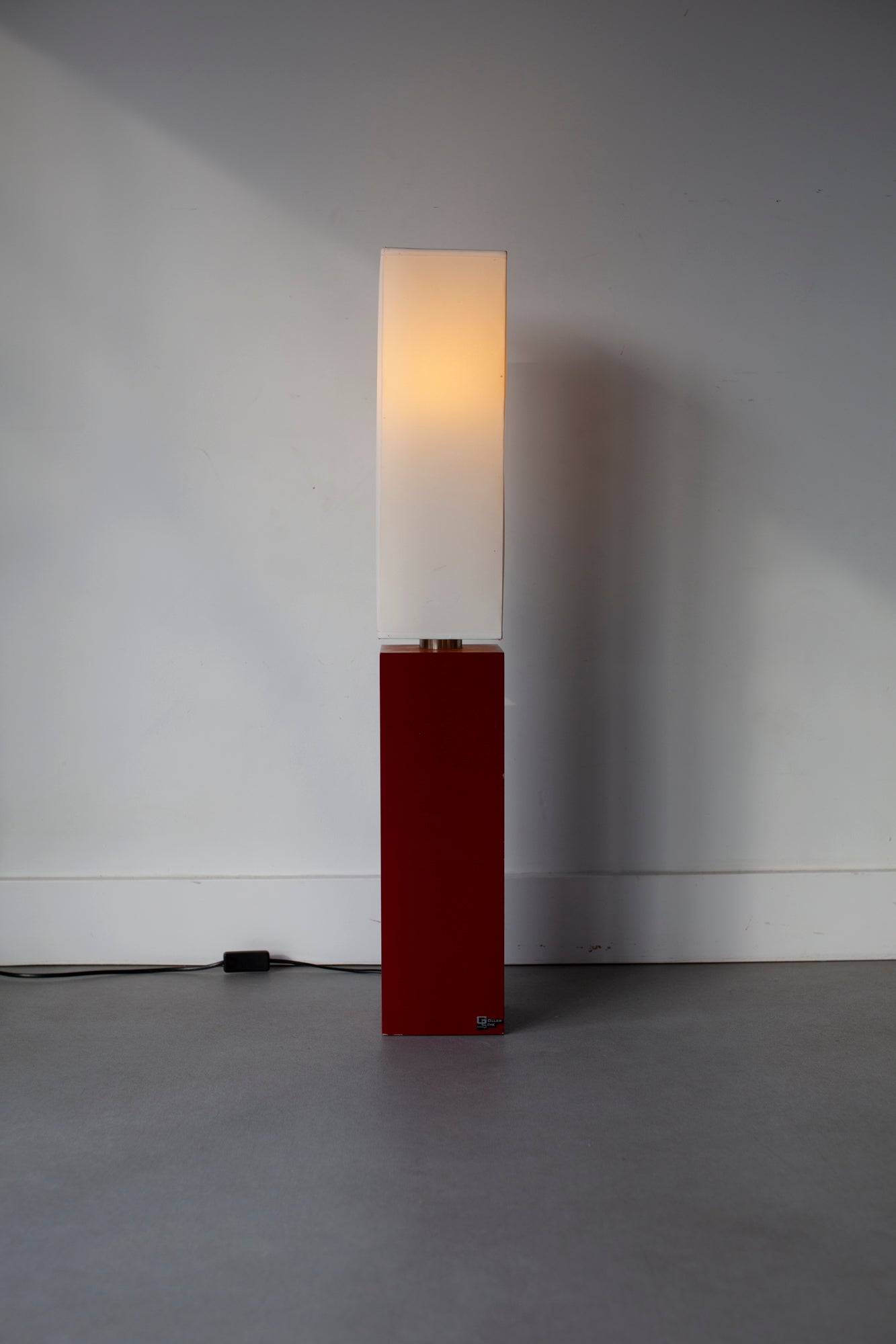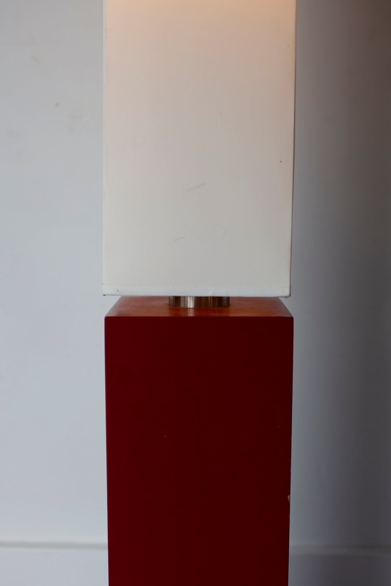 Red laquered  Goller Line table lamp / floor lamp on wooden base by Sorpetaler Leuchten 80's. The base and the shade are in fair to good vintage condition; small chips missing on the base, small spots on the shade.