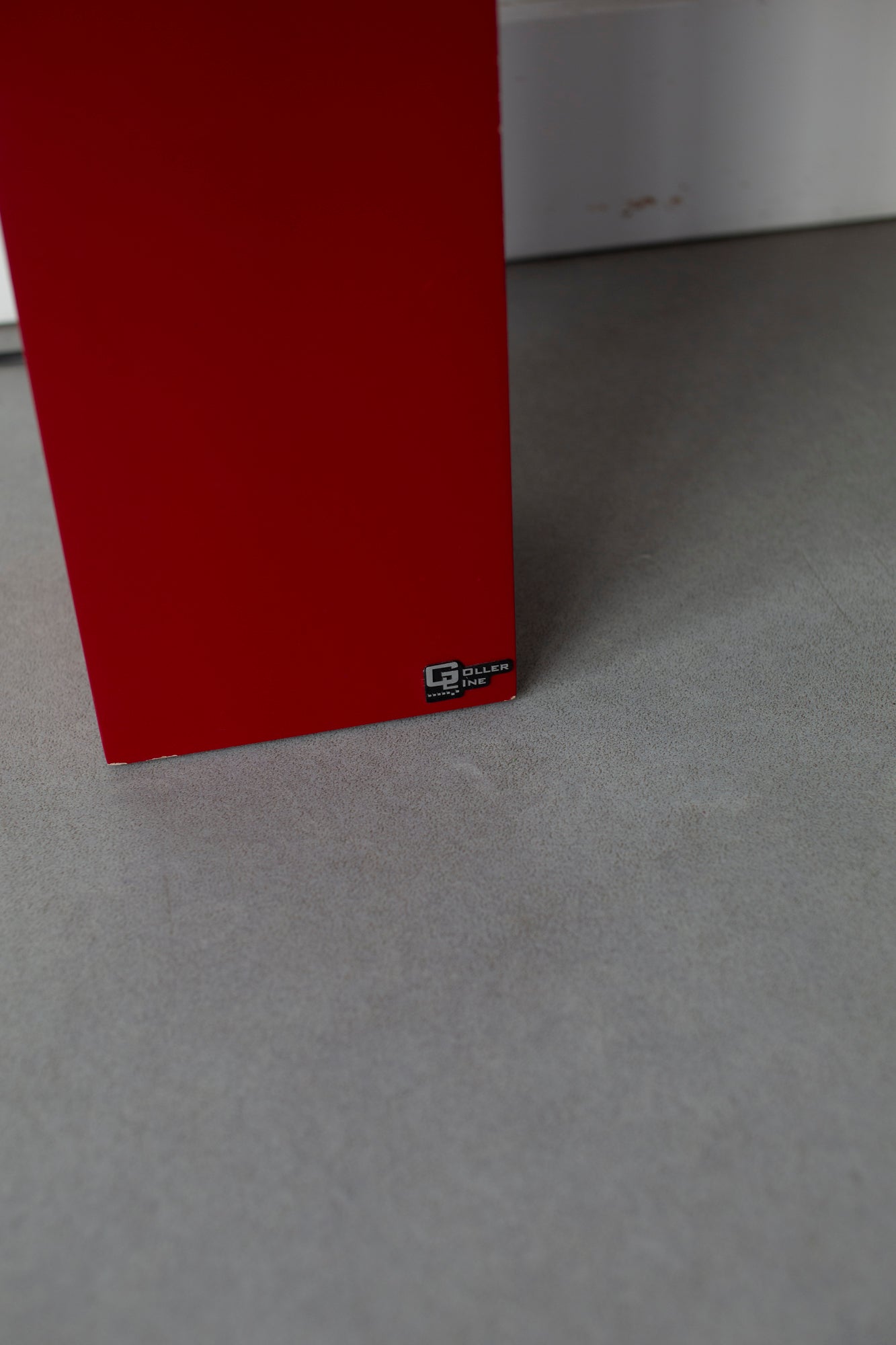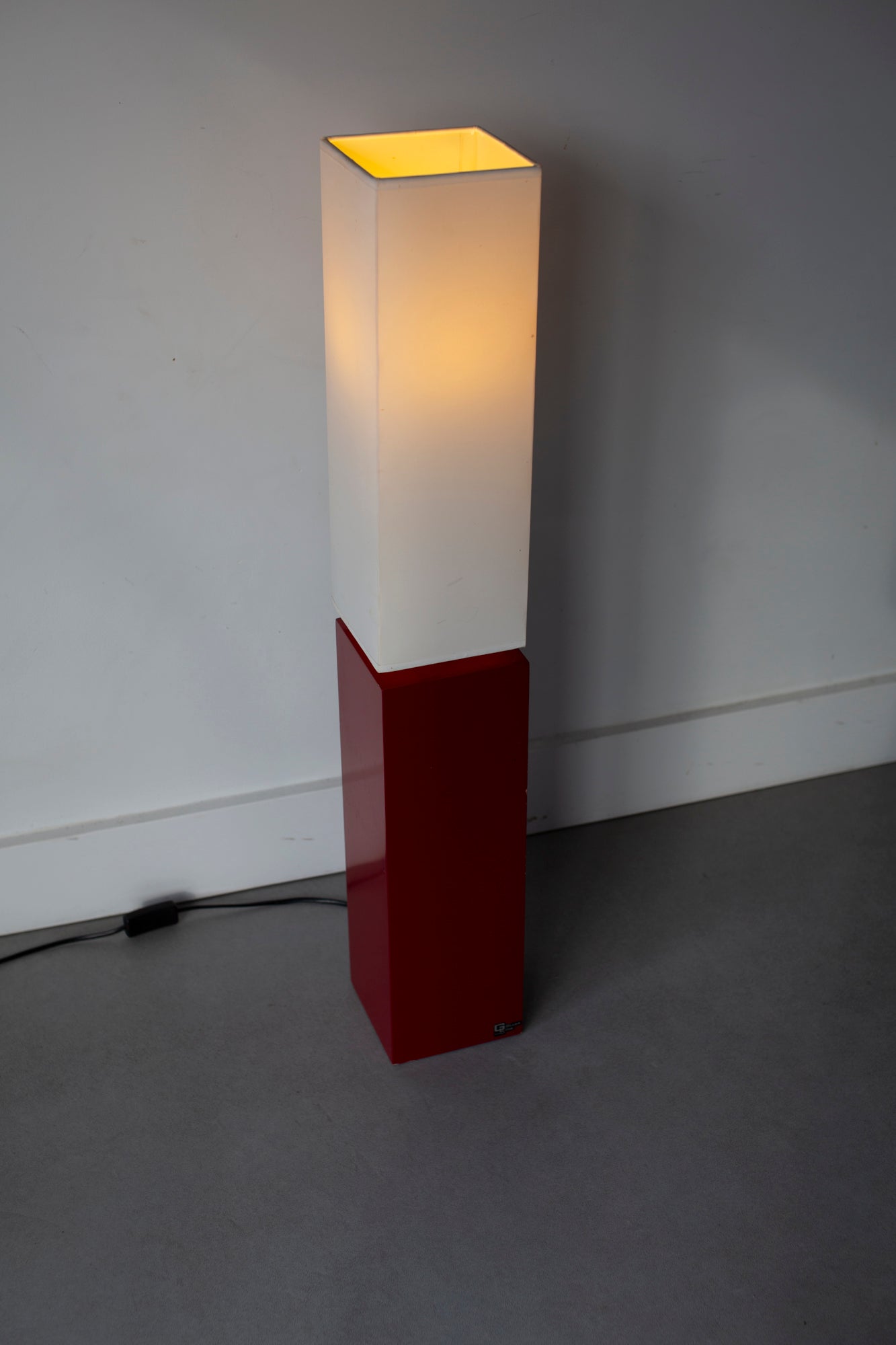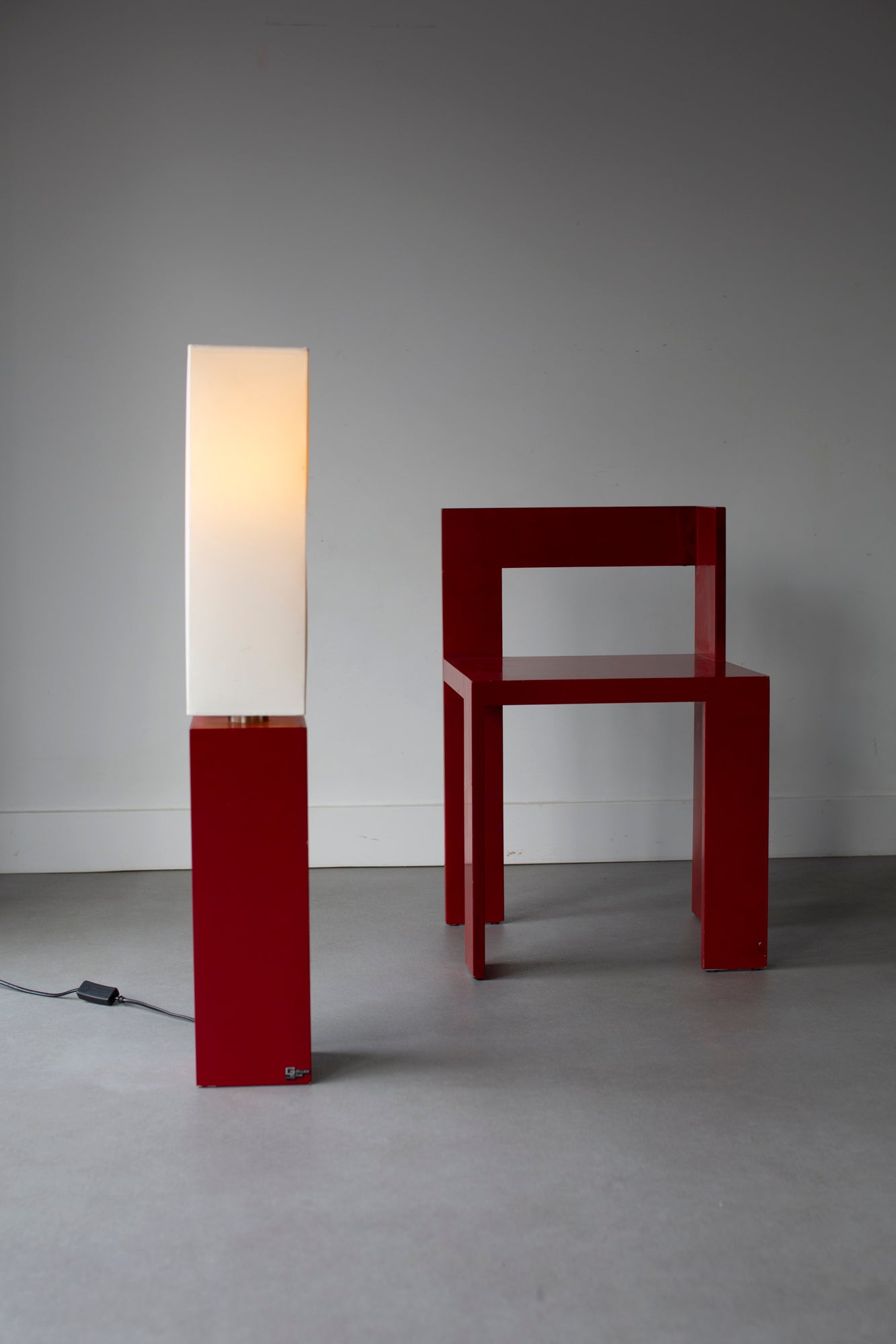 Red laquered  Goller Line table lamp / floor lamp on wooden base by Sorpetaler Leuchten 80's. The base and the shade are in fair to good vintage condition; small chips missing on the base, small spots on the shade.