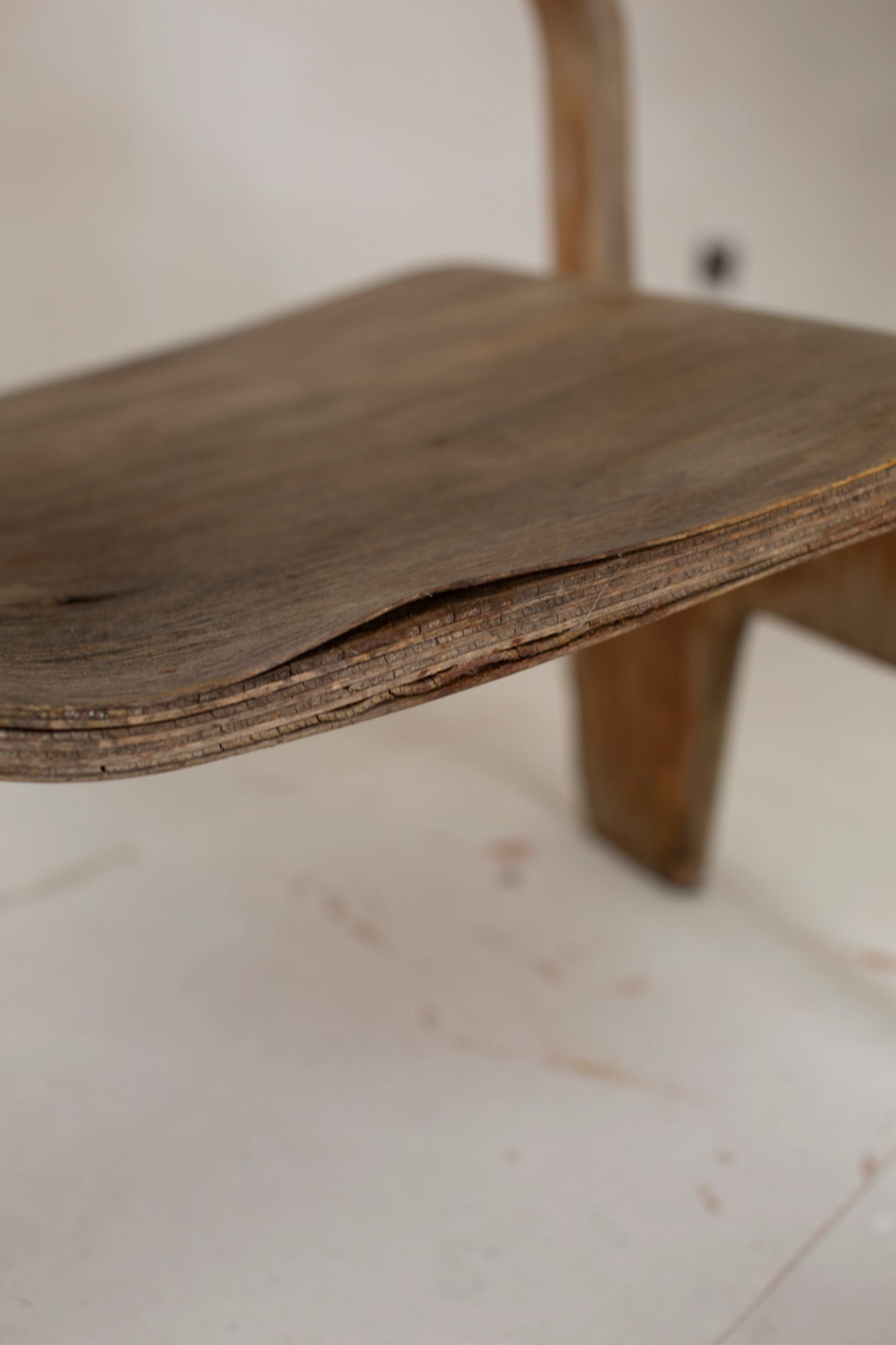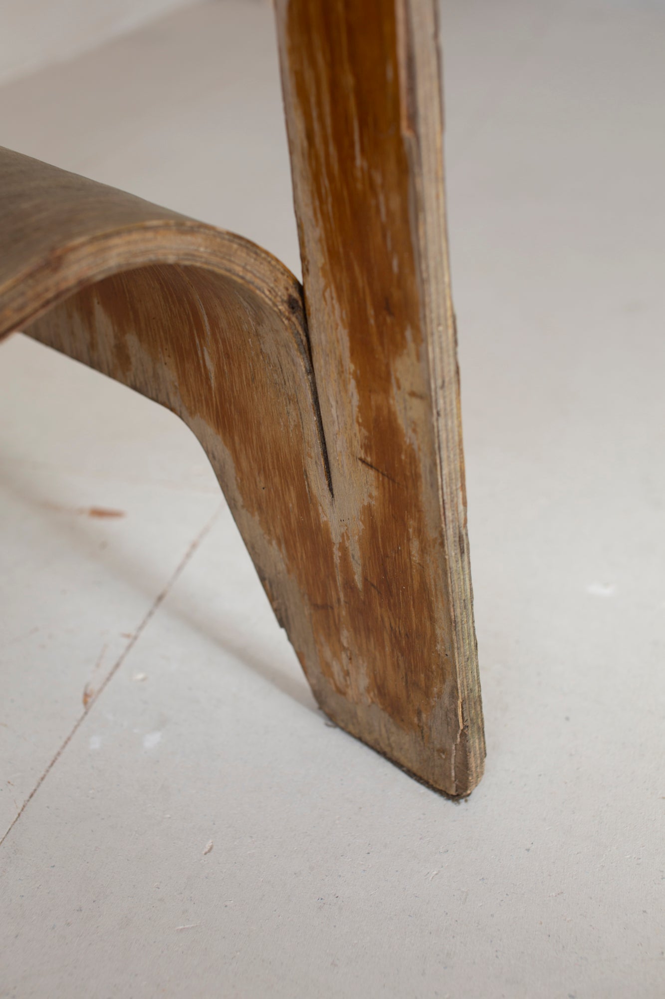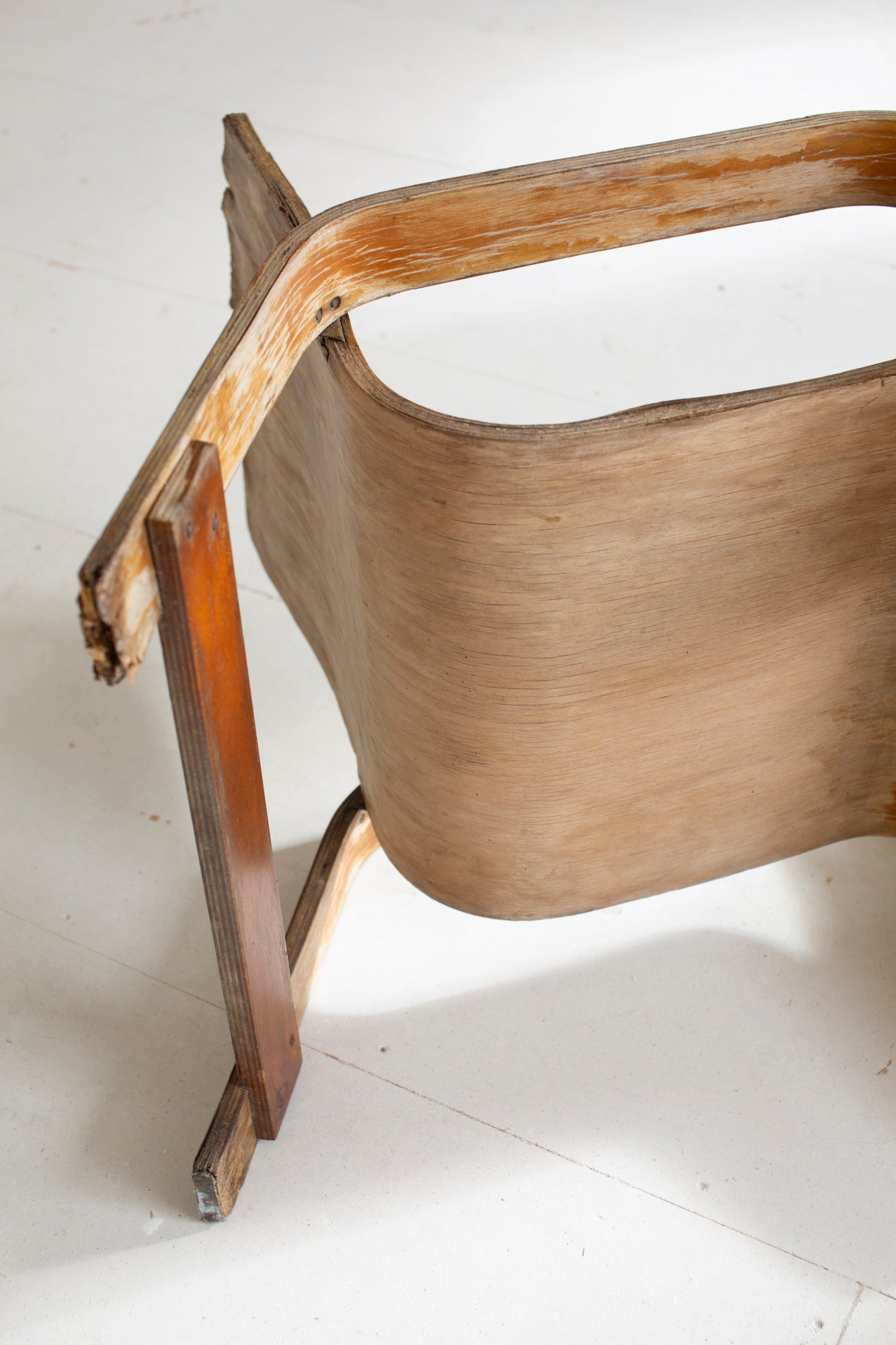 This example is in poor condition: water damage, woodworm, chips and rot are present, not suitable for seating at the moment. Yet precisely in this state, the chair reveals its full story — a tangible testament to both experimentation and the transience of material.