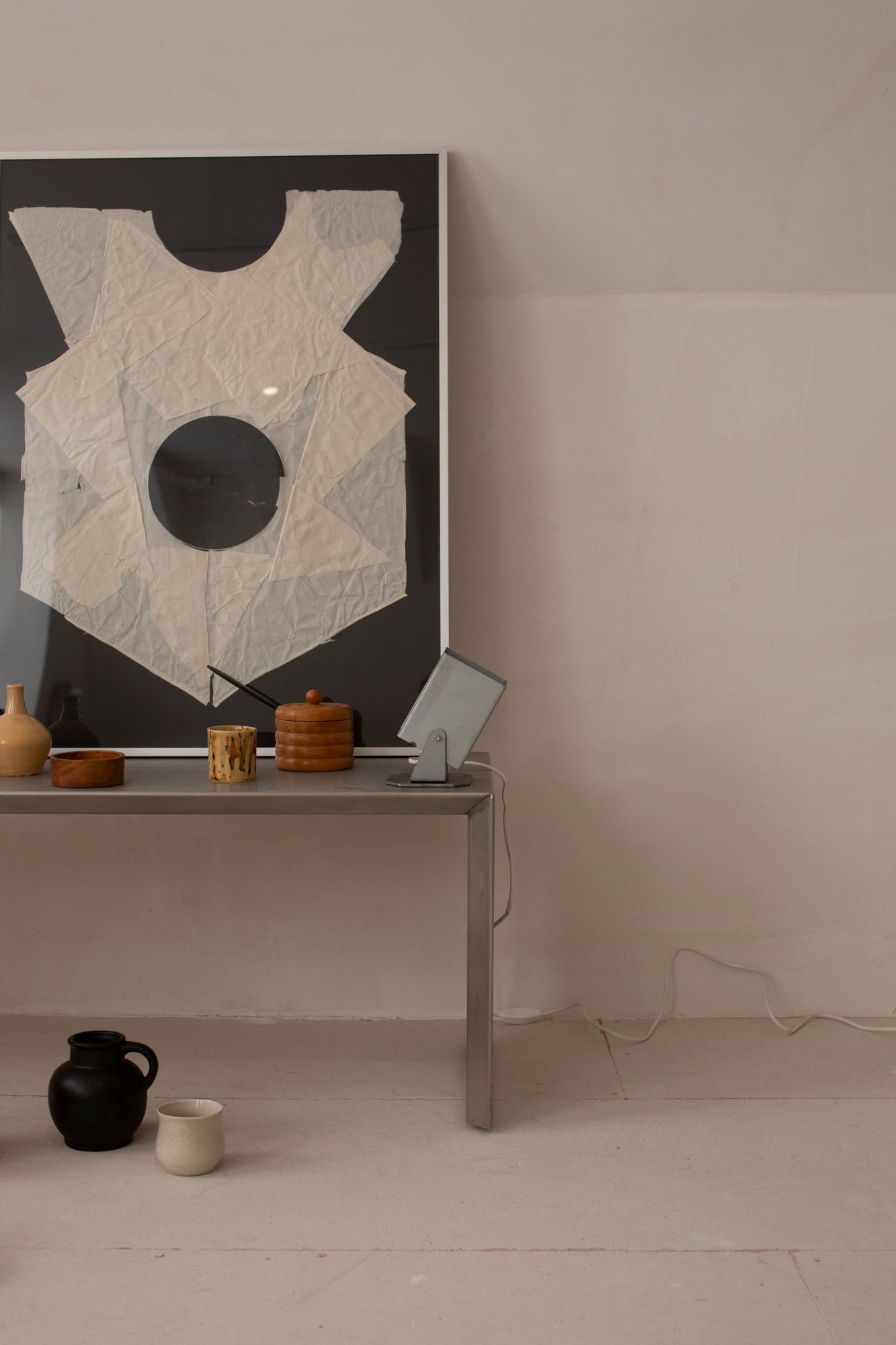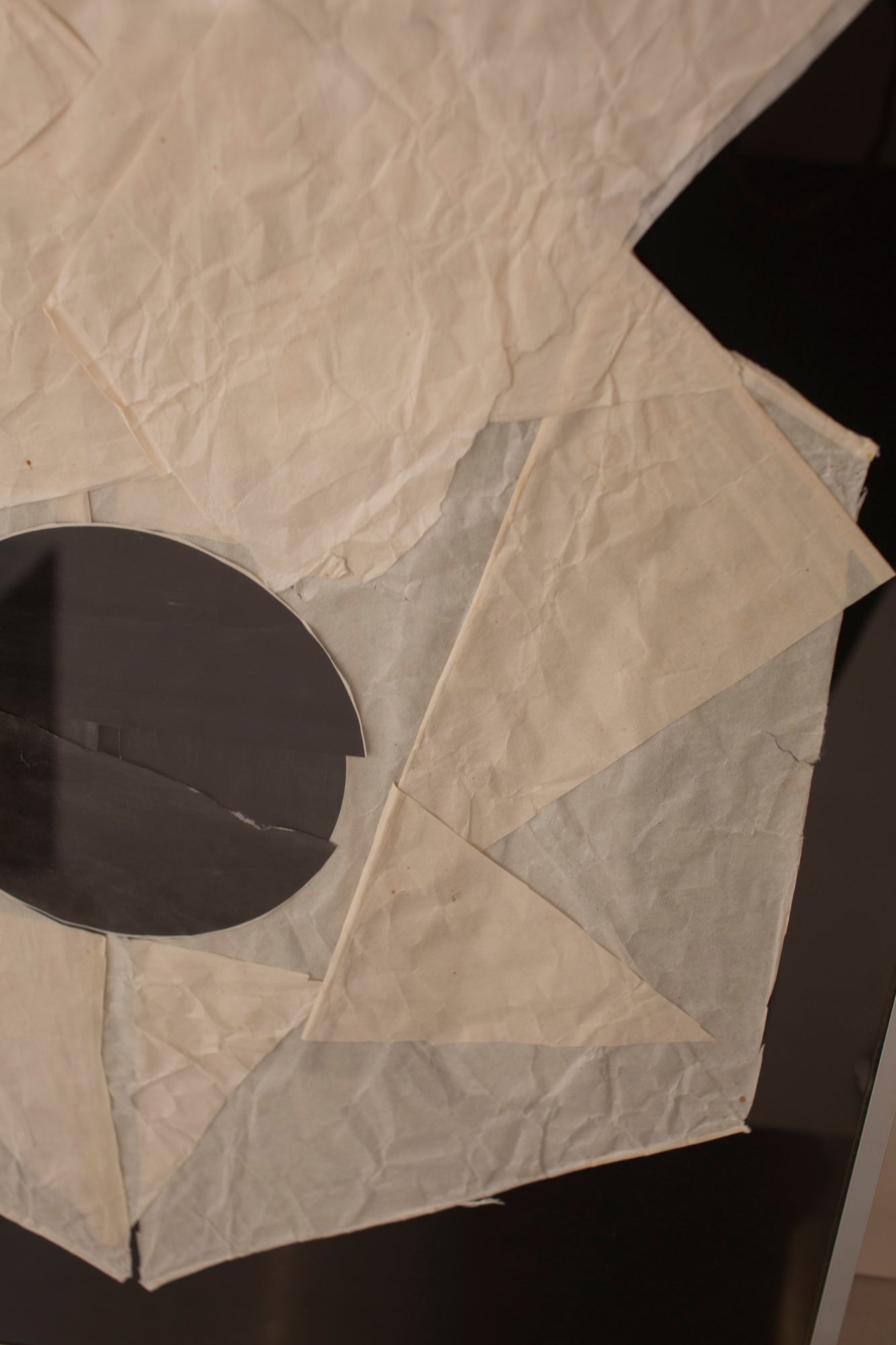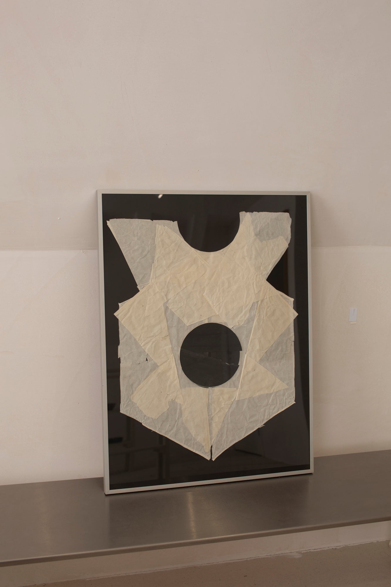 This unique artwork is created from a salvaged fragment of an original Akari lampshade by Isamu Noguchi. The delicate, crumpled paper becomes both material and memory — an echo of light transformed into a new composition. Framed in a vintage aluminum frame, this piece bridges design and art, balancing between object and atmosphere.