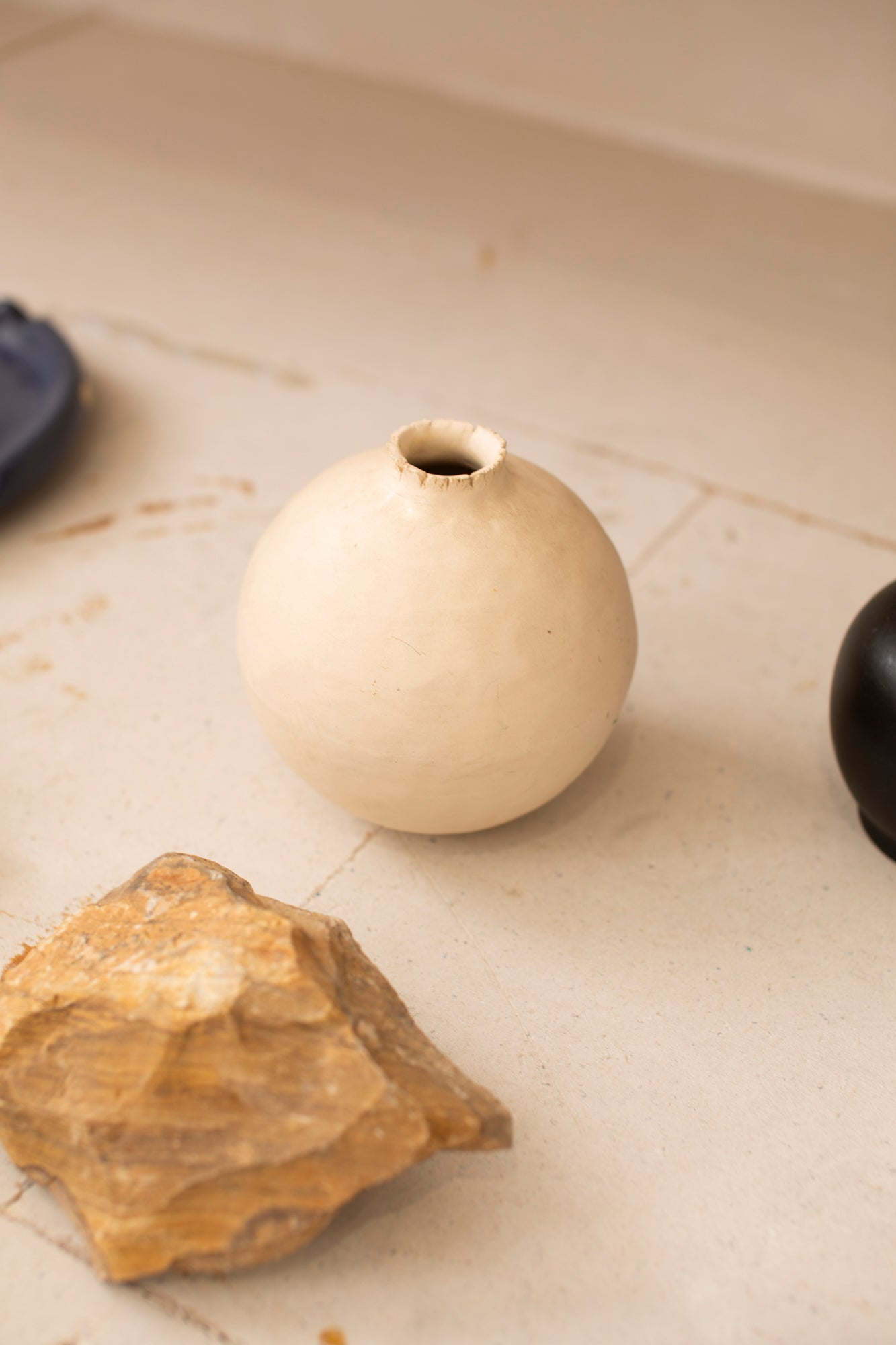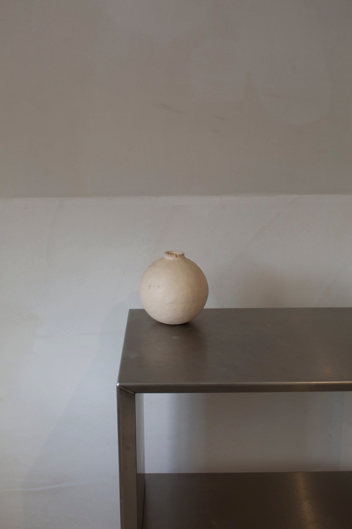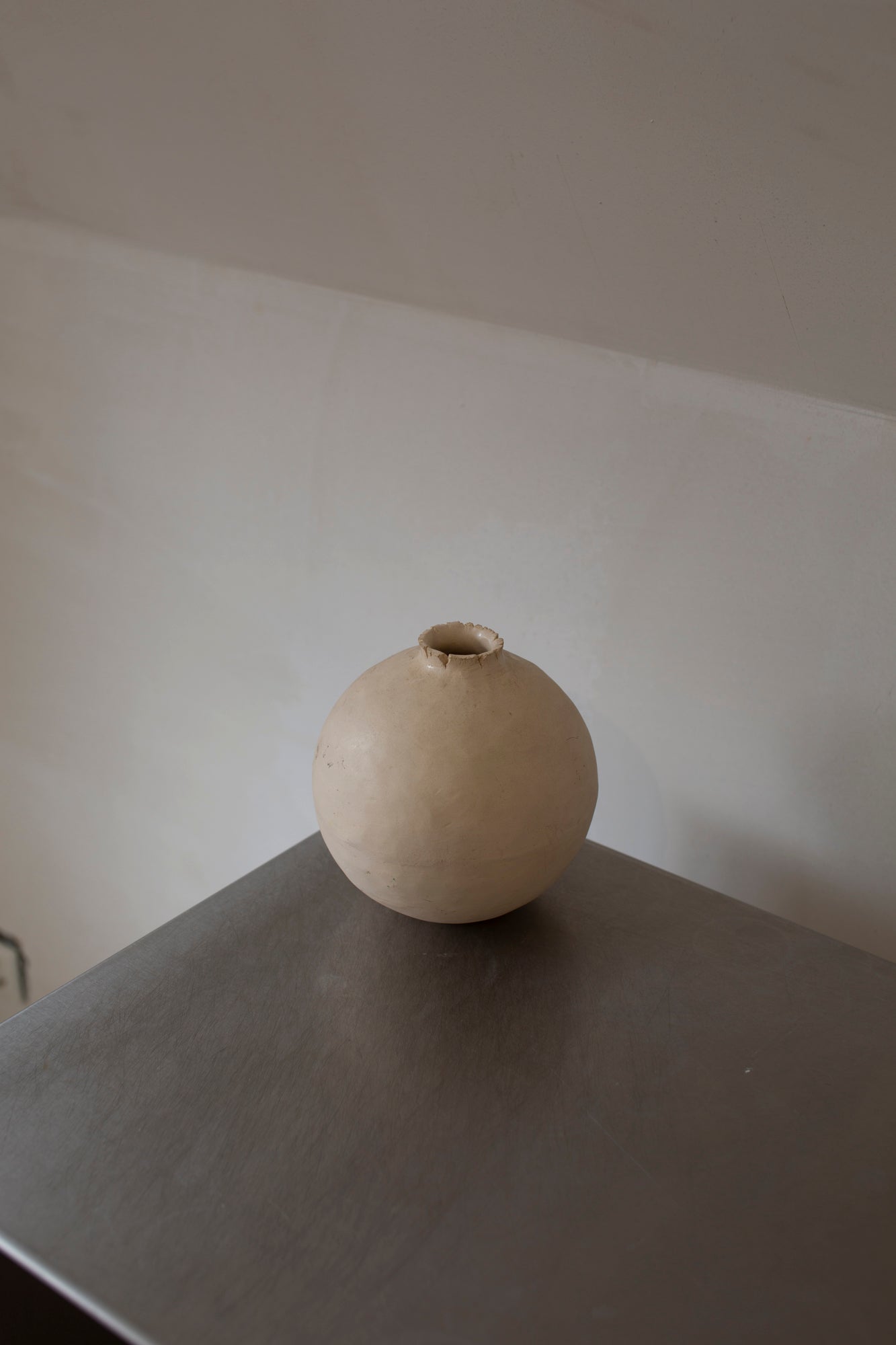 This perfectly round, bulbous ceramic vase features a raw, irregular edge at its opening, blending refined craftsmanship with natural imperfection. The smooth, rounded body contrasts elegantly with the textured rim, creating a sophisticated piece that enhances any interior. Ideal for displaying flowers or as a standalone decorative object, it brings understated artistry and depth to your living space.