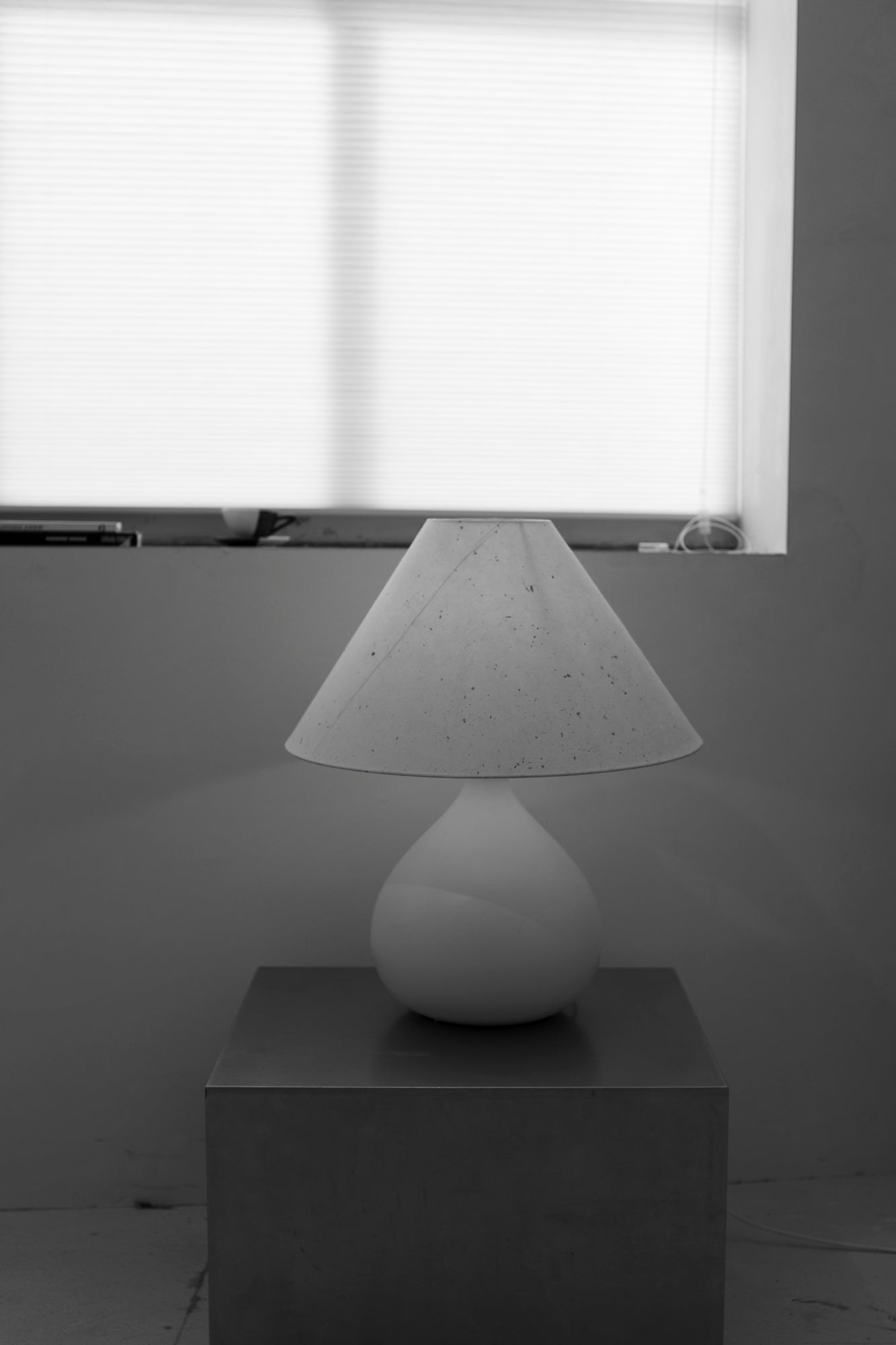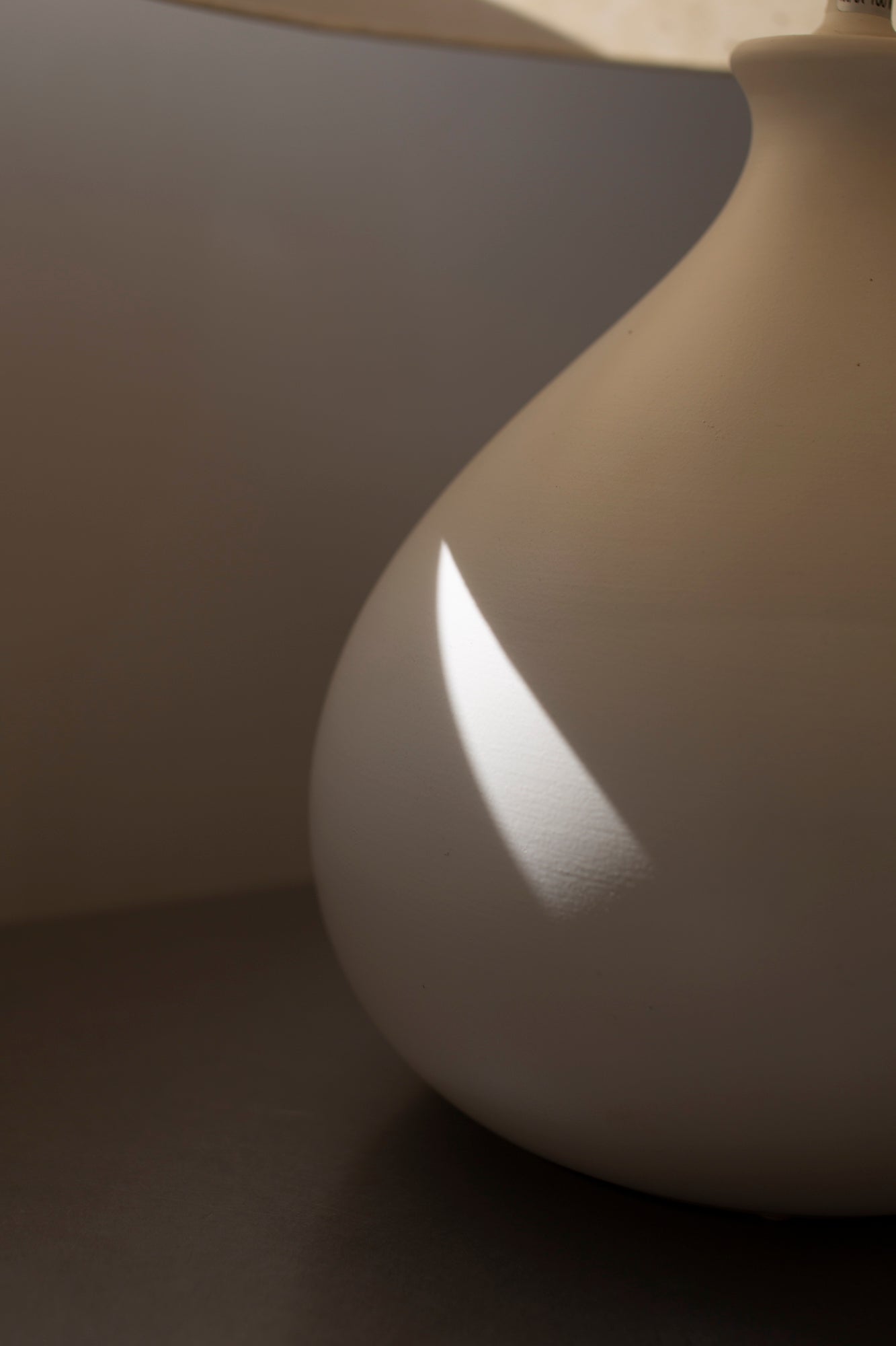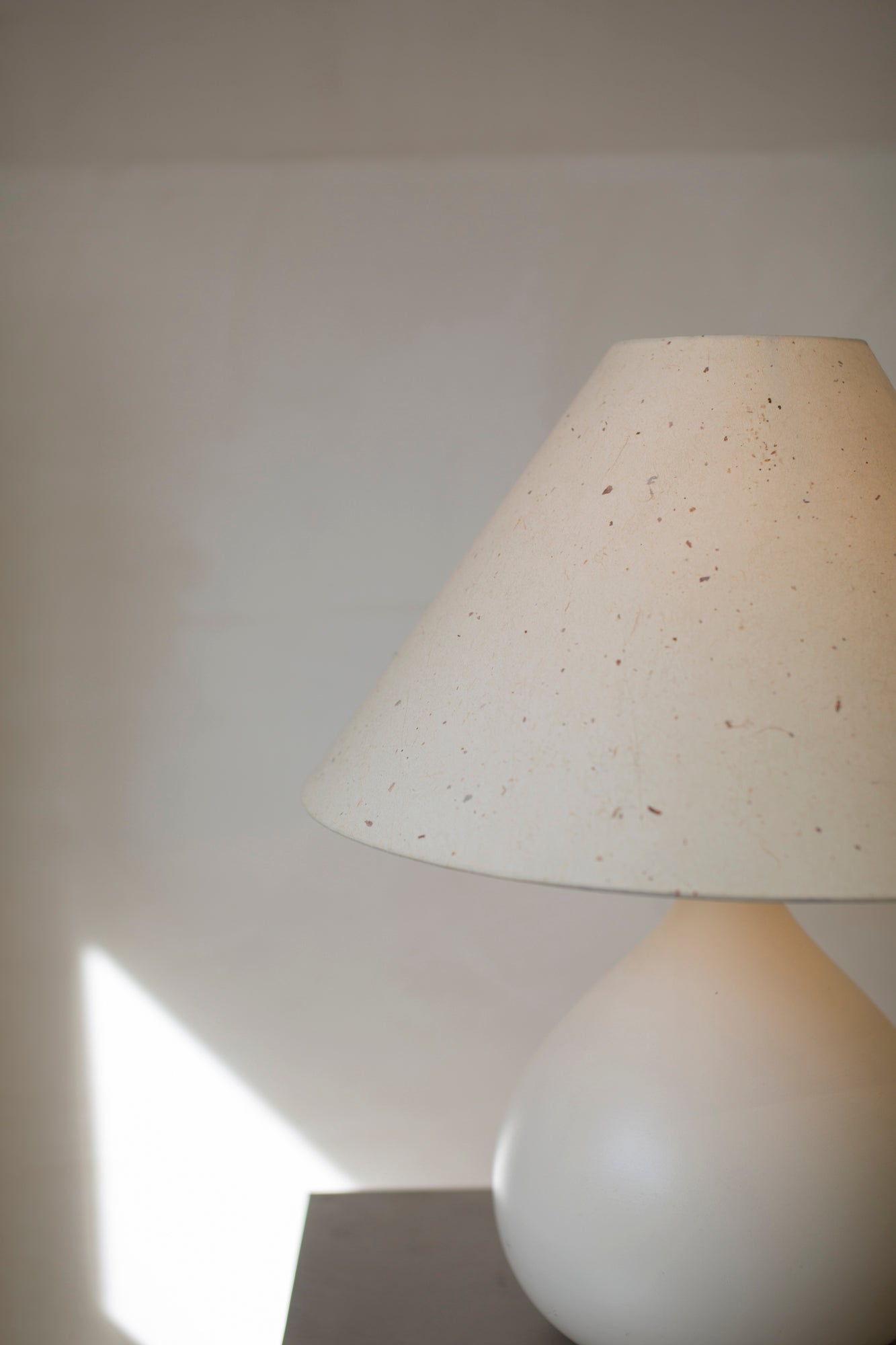This statement table lamp features a pear-shaped ceramic silhouette with a speckled paper shade that softly diffuses light. Its gentle glow creates a warm, inviting atmosphere while serving as an elegant eye-catcher in any room. Ideal for adding subtle charm and comfort to your living space.