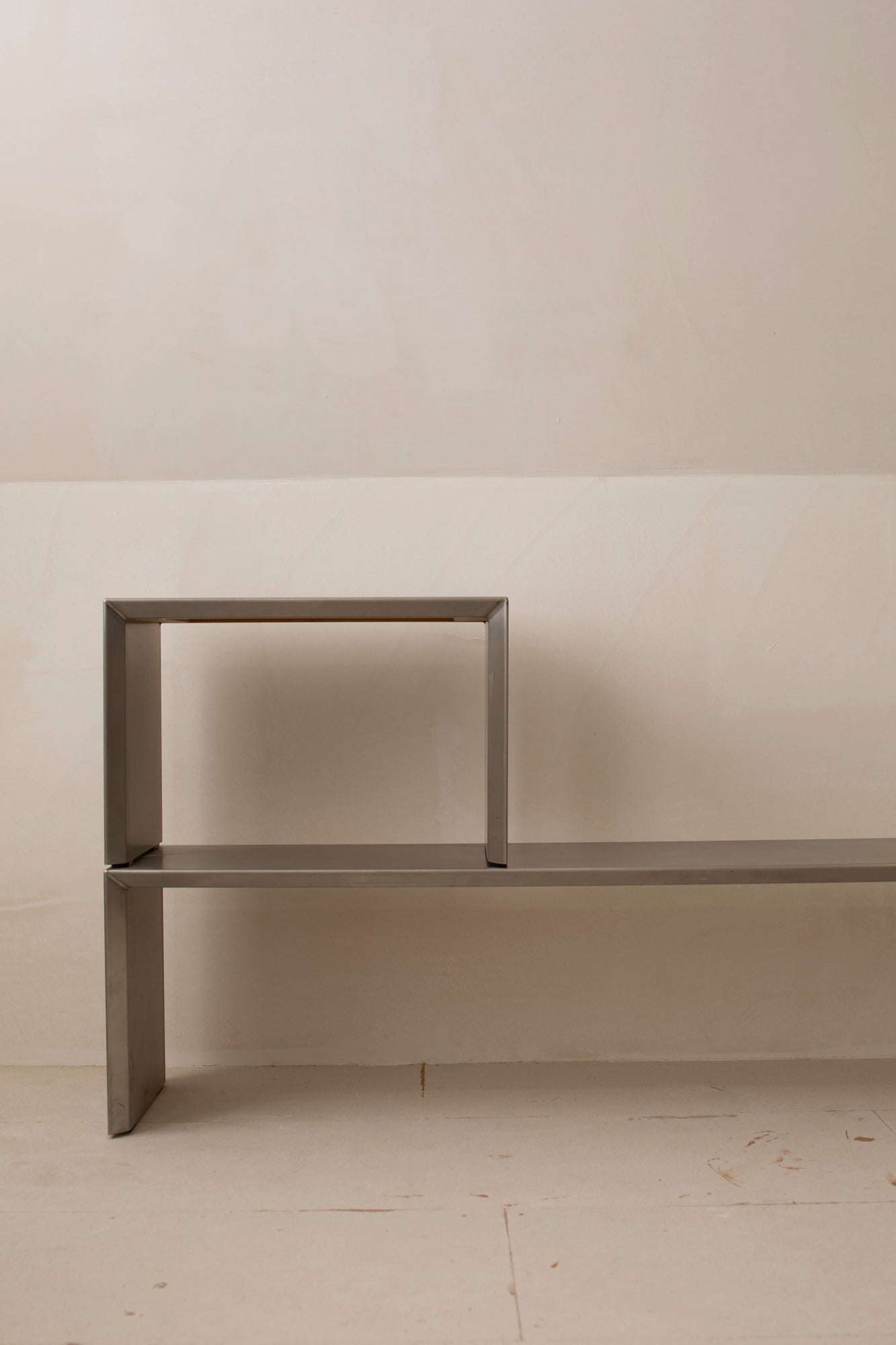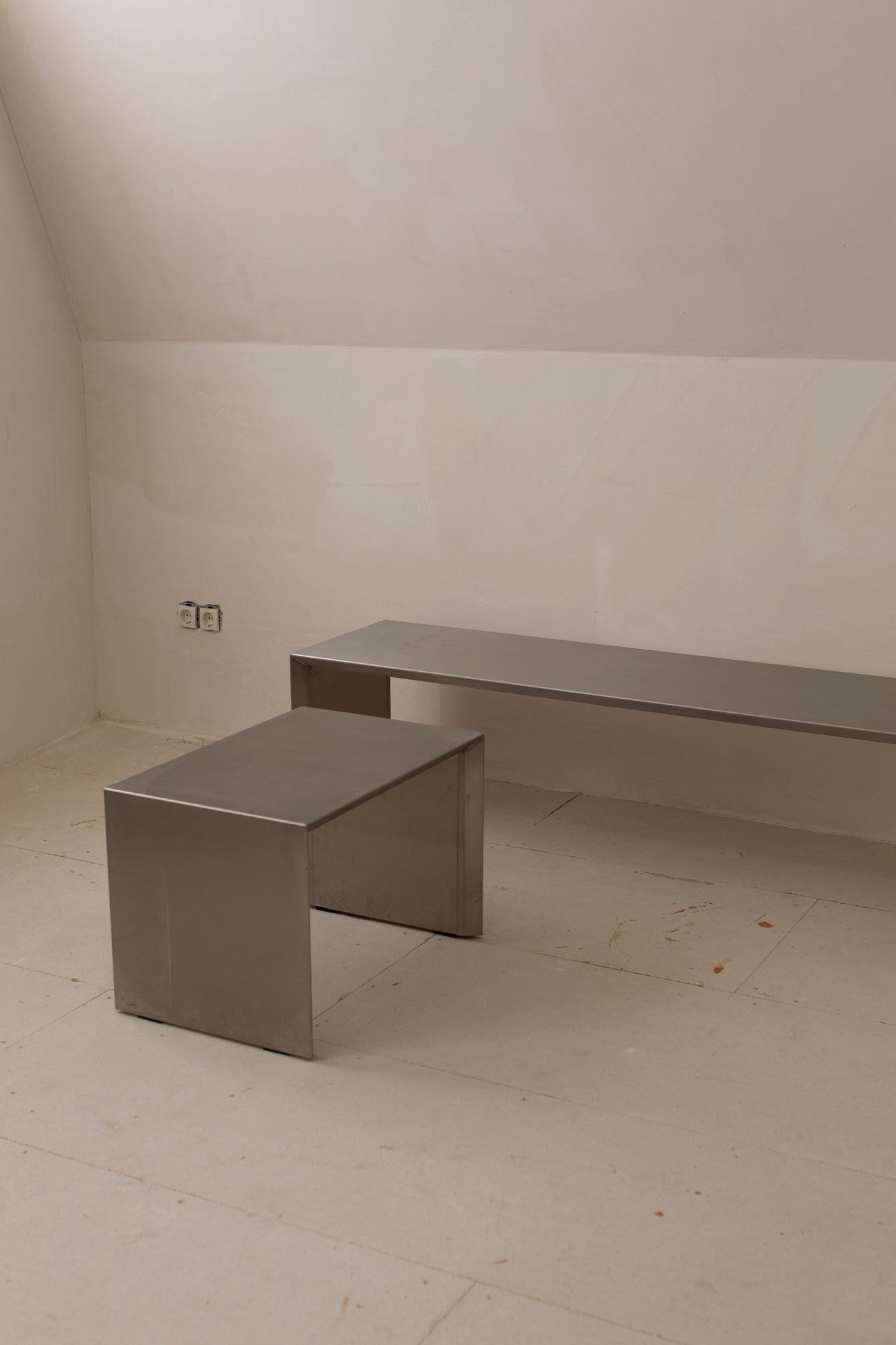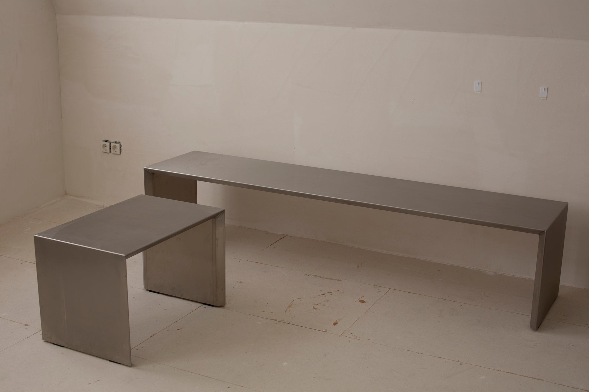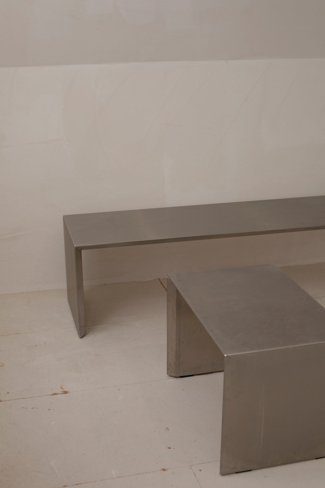 This elegant set of two stainless steel benches doubles as versatile side tables, blending modern design with robust wooden reinforcement. Crafted for durability and style, they provide sleek functionality while enhancing any contemporary space with a refined, minimalist aesthetic.