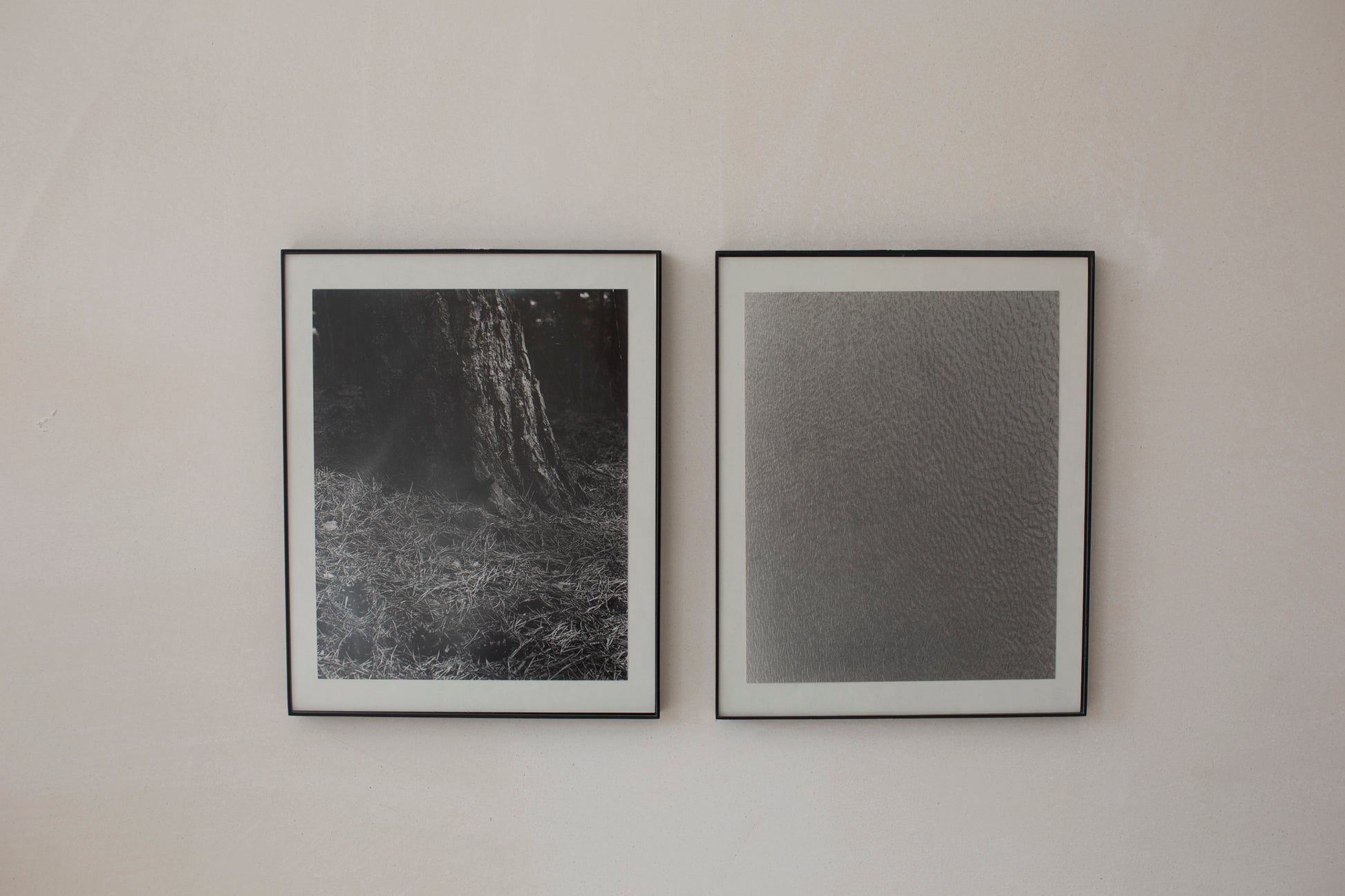 The works capture contrasting textures and atmospheres: the rippling surface of water and the grounded presence of a tree trunk. Grounded yet fluid.